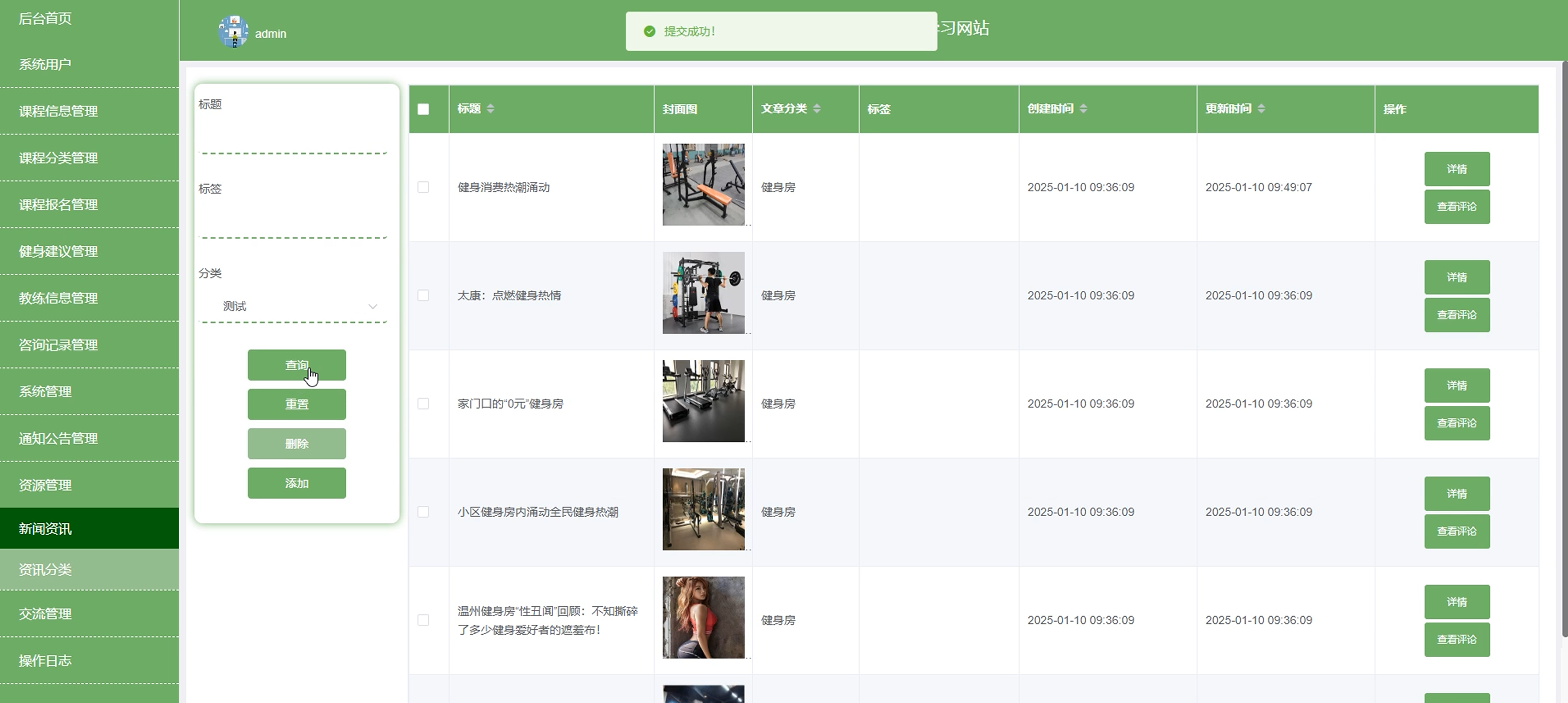 健身建议管理:管理员可以查看和管理教练为学员提供的健身建议和训练计划,确保建议的专业性和实用性,提升学员的健身体验。