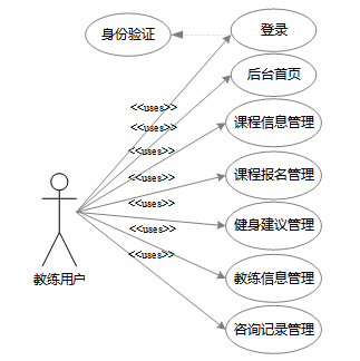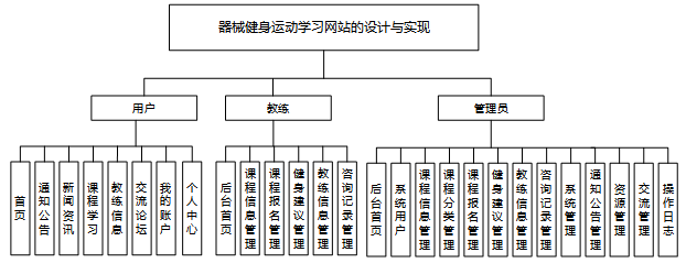 器械健身运动学习网站系统旨在通过不同角色的功能模块实现对健身平台的全面管理。系统主要分为用户、教练和管理员两大角色,每个角色都有其独特的功能模块,以确保健身平台运营的高效性和透明性。