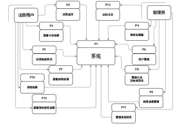 顶层数据流是指系统与外部实体之间的数据流动,描述了系统的整体数据流。在器械健身运动学习网站中,顶层数据流包括管理员录入用户信息、注册用户浏览资讯信息、提交报名信息、教练审核报名信息等。
