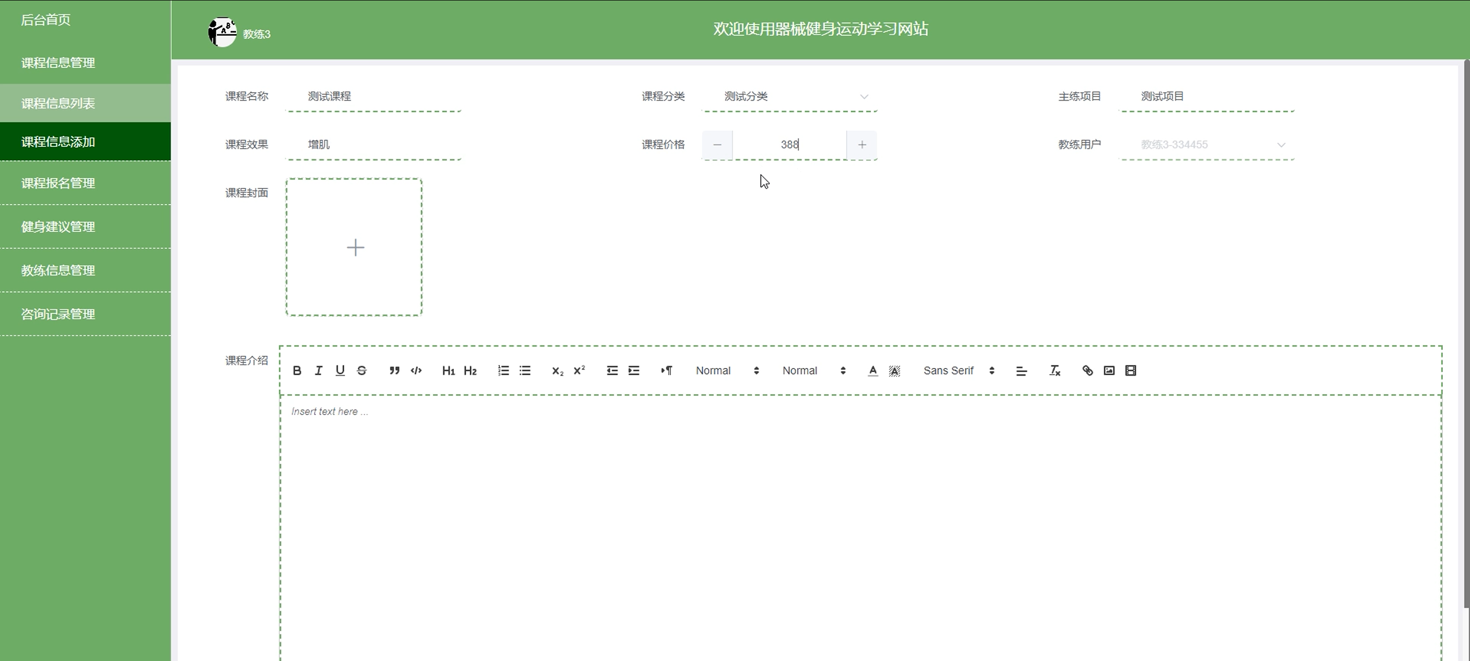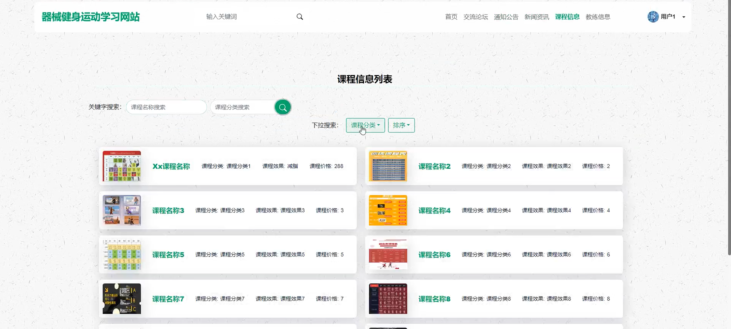 课程信息:展示各类健身课程的详细信息,包括课程内容、教练介绍、课程时间、价格等,用户可以浏览和选择适合自己的课程进行报名。