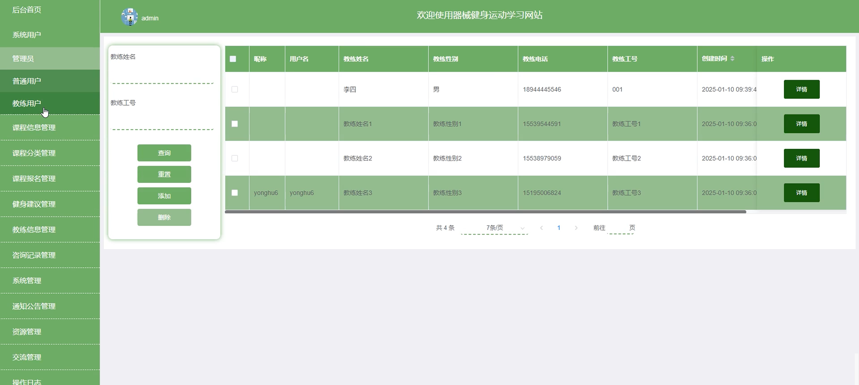 教练信息管理:管理员可以查看和管理教练的个人信息、擅长项目、健身经验等,确保教练信息的准确性和完整性,帮助学员了解教练的专业背景和教学风格。