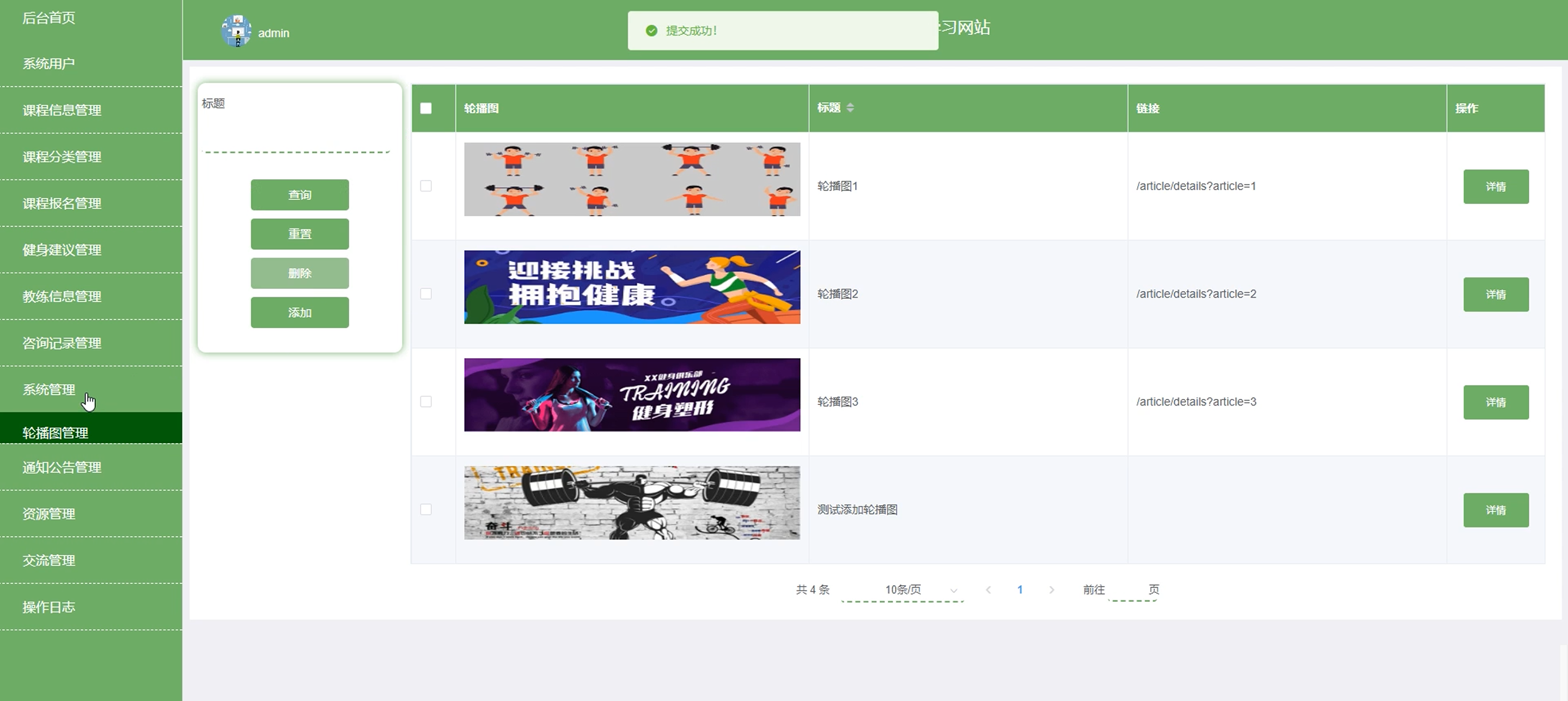 管理员可以设置首页展示的轮播广告或重要信息,并进行增删改查等操作。其界面如下图所示。