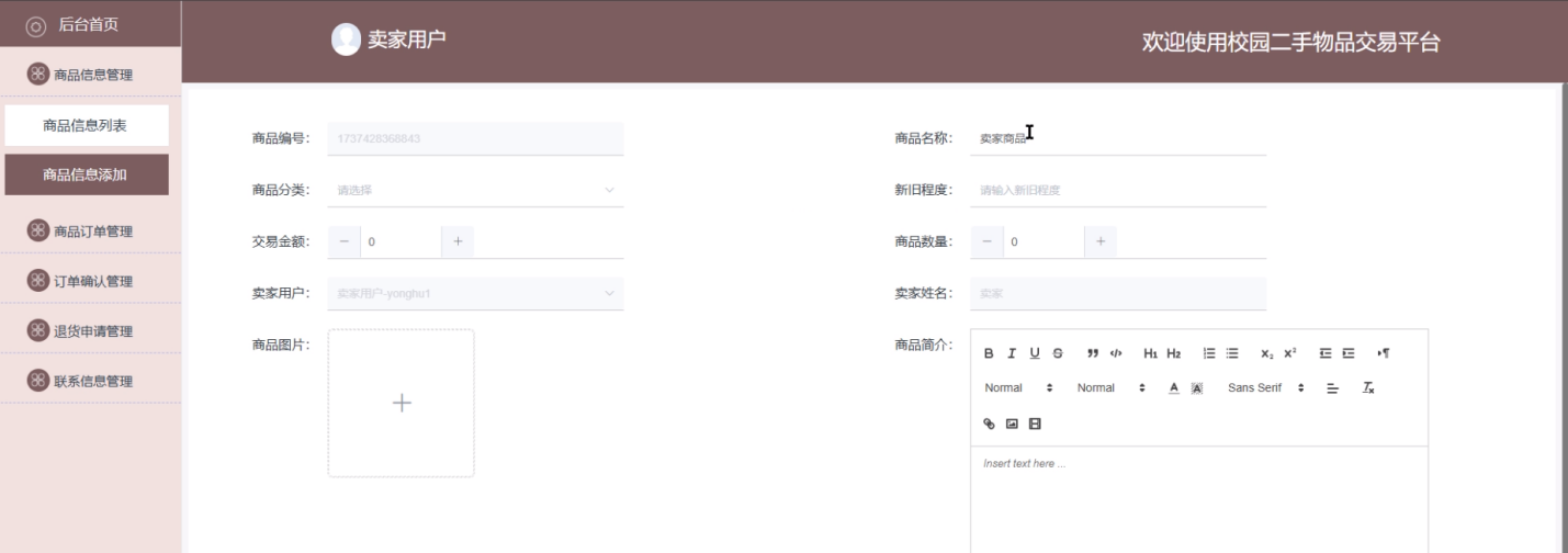 在该模块用户可以对商品信息列表进行管理和进行商品信息添加。如点击“商品信息列表”进入页面可以查看列表中某个商品信息的详情和评论信息;点击“商品信息添加”进入页面填写任商品名称、商品分类、交易金额等信息后点击“提交”即可完成商品信息的添加,添加后需由管理员审核,审核通过后才能展示在前端界面。以商品信息添加为例,其界面图如下图5.7所示。