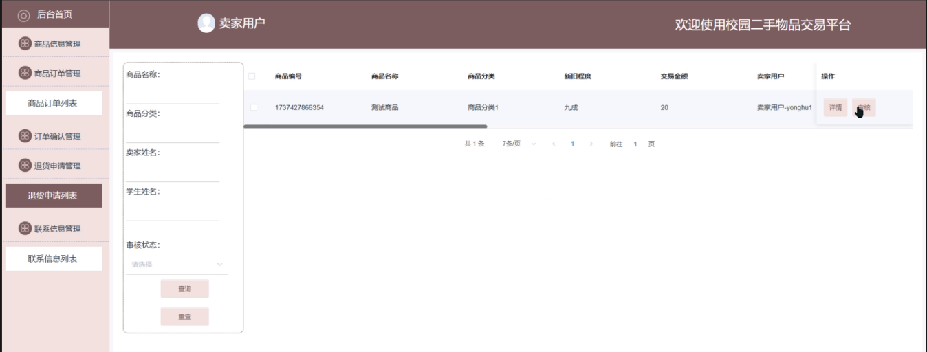用户可以查看退货申请列表中某个用户提交的退货申请详情并进行审核,可以对列表信息进行查询和重置操作。支持通过输入商品名称、商品分类或选择订单状态来查询相关退货申请信息。其界面图如下图5.9所示。