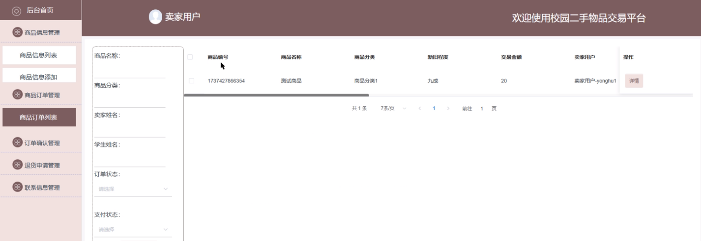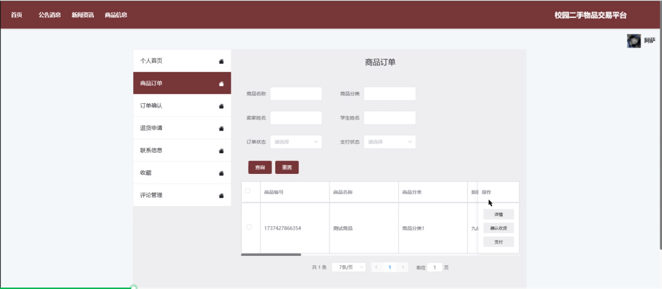 用户可以查看商品订单列表中某个订单的详情并可以修改订单状态信息,可以对列表信息进行查询和重置操作。支持通过输入商品名称、商品分类等信息或选择订单状态、支付状态来查询相关订单信息。其界面图如下图5.13所示。