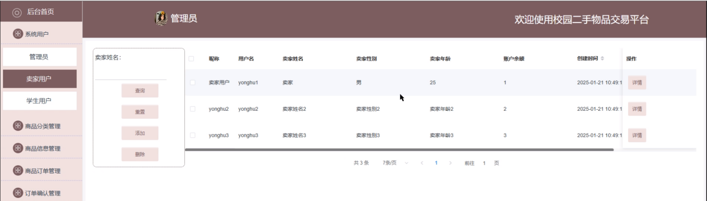 This paper introduces the design and implementation process of a campus second-hand goods trading platform developed based on the Spring Boot framework. The platform mainly targets three types of user groups: student users, seller users, and administrators, and provides diversified functional services. Student users can register and log in through the platform, browse the homepage's carousel, news, announcements, and product recommendations, like, bookmark, comment, and purchase on the product details page, and directly contact sellers. The personal center allows for the management of personal information, viewing of order status, and processing of return requests.