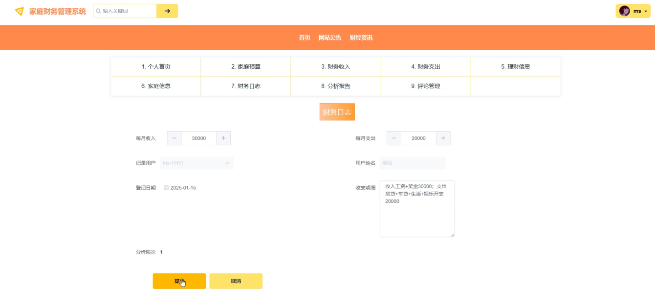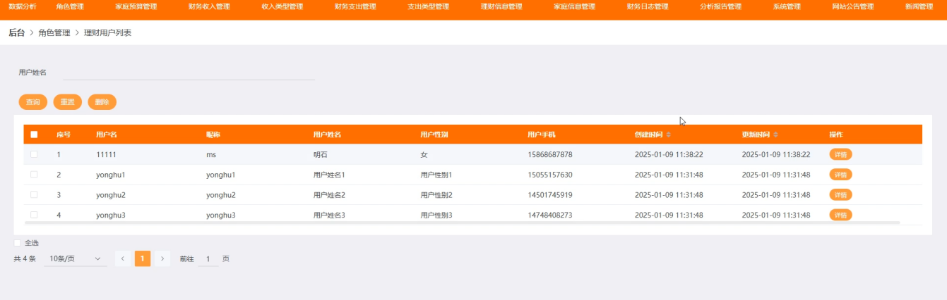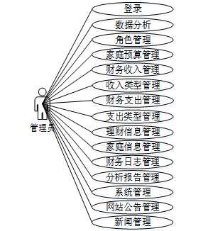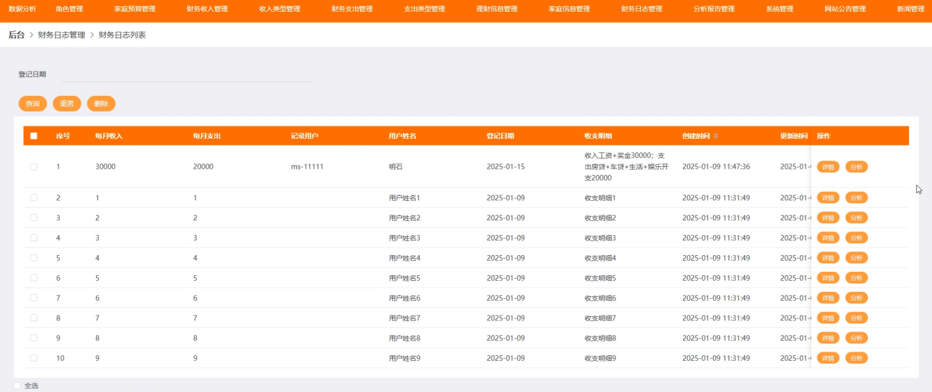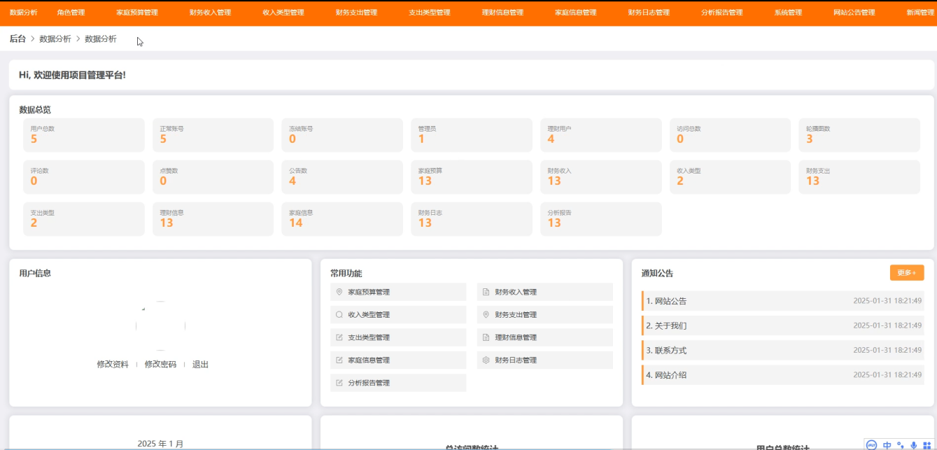 后台管理端:管理员可登录系统后台进行管理,拥有数据分析、角色管理、家庭预算管理、财务收入管理、收入类型管理、财务支出管理、支出类型管理、理财信息管理、家庭信息管理、财务日志管理、分析报告管理、系统管理、网站公告管理、新闻管理、等用户信息等功能。