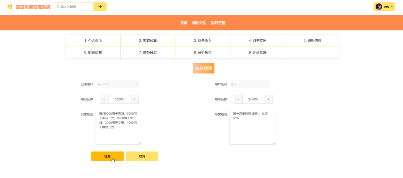 点击添加家庭预算,必填项合法输入,点击保存 |