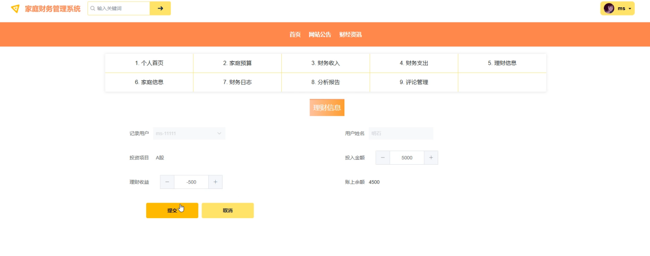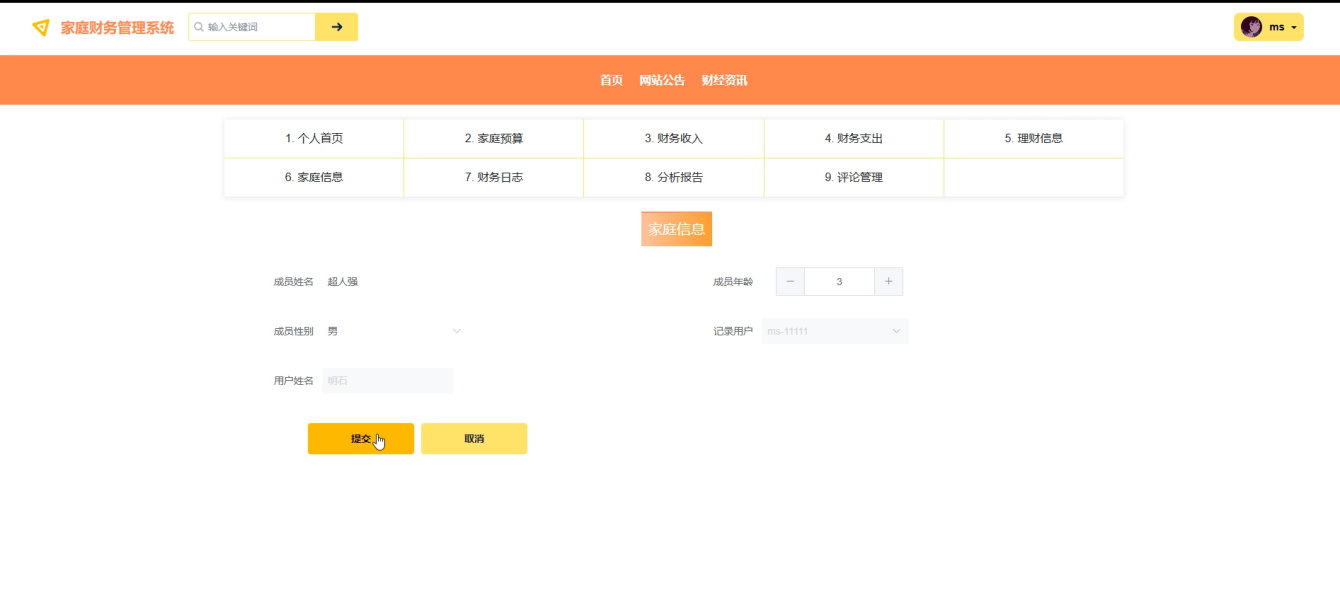 Through the development of this system, users can easily manage their family's financial data, perform operations such as budget allocation, income and expenditure recording, and financial analysis. Administrators can manage different roles and generate various analysis reports to help family members have a clearer understanding of their financial situation and achieve financial goals. The design and implementation of the system can effectively improve the efficiency of family financial management, provide comprehensive financial management services, and make family finance more scientific and systematic.