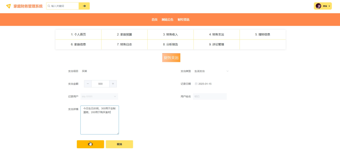 点击添加财务支出,必填项合法输入,点击保存 |