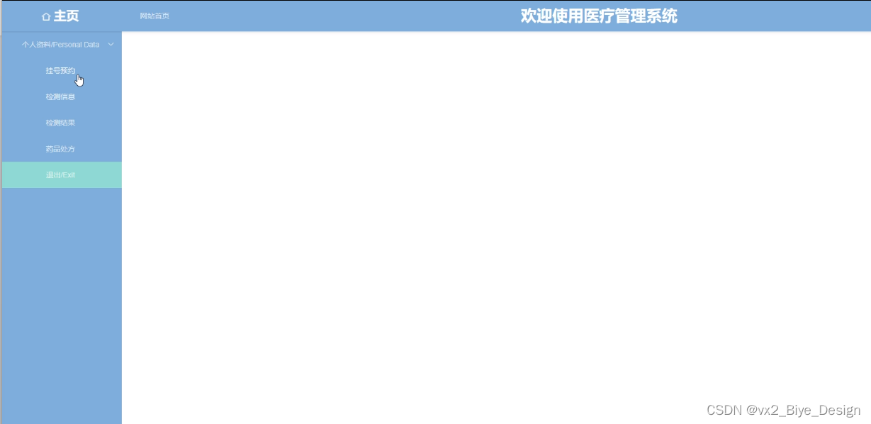 用户通过登录进入到系统操作界面后,可以根据需求对首页、个人资料(个人信息、修改密码)、挂号预约、检测信息、检测结果、药品处方等进行管理维护操作,如图5-3所示。