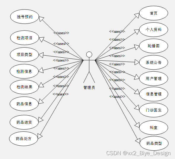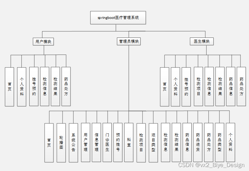 基于医疗管理系统的设计可以实现首页、个人资料(个人信息、修改密码)、公共管理(轮播图、系统公告)、用户管理(管理员、医生用户、普通用户)、信息管理、门诊医生、挂号预约、检测项目、项目类型、检测信息、检测结果、药品信息、药品进货、药品处方、药品类型、科室等详细的了解及统计分析。根据系统功能需求建立的模块关系图如下图: