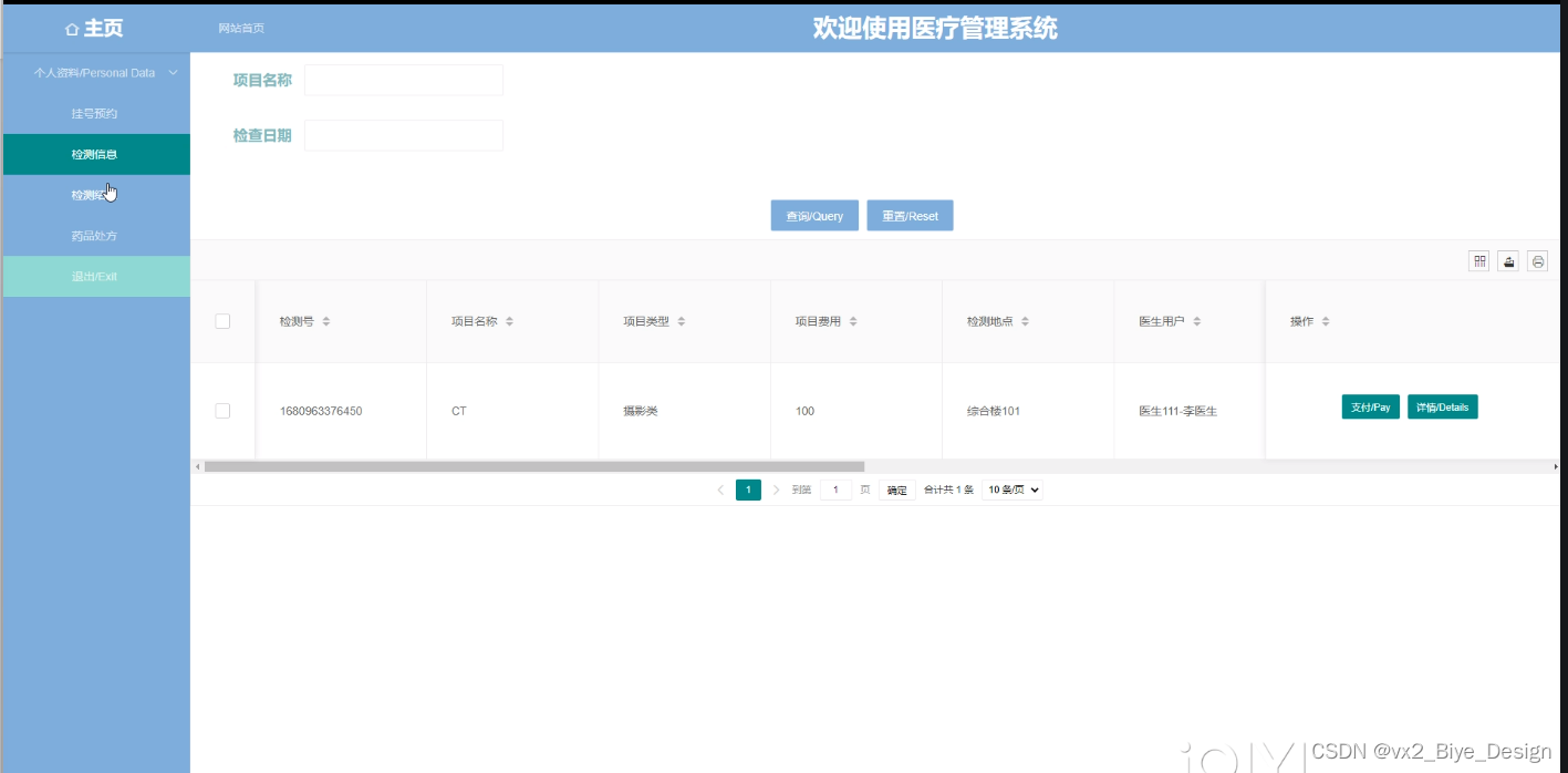 检测信息,用户进入检测信息页面可以查看检测号、项目名称、项目类型、项目费用、检测地点、医生用户等内容,并进行支付、查询等操作,如图5-4所示。