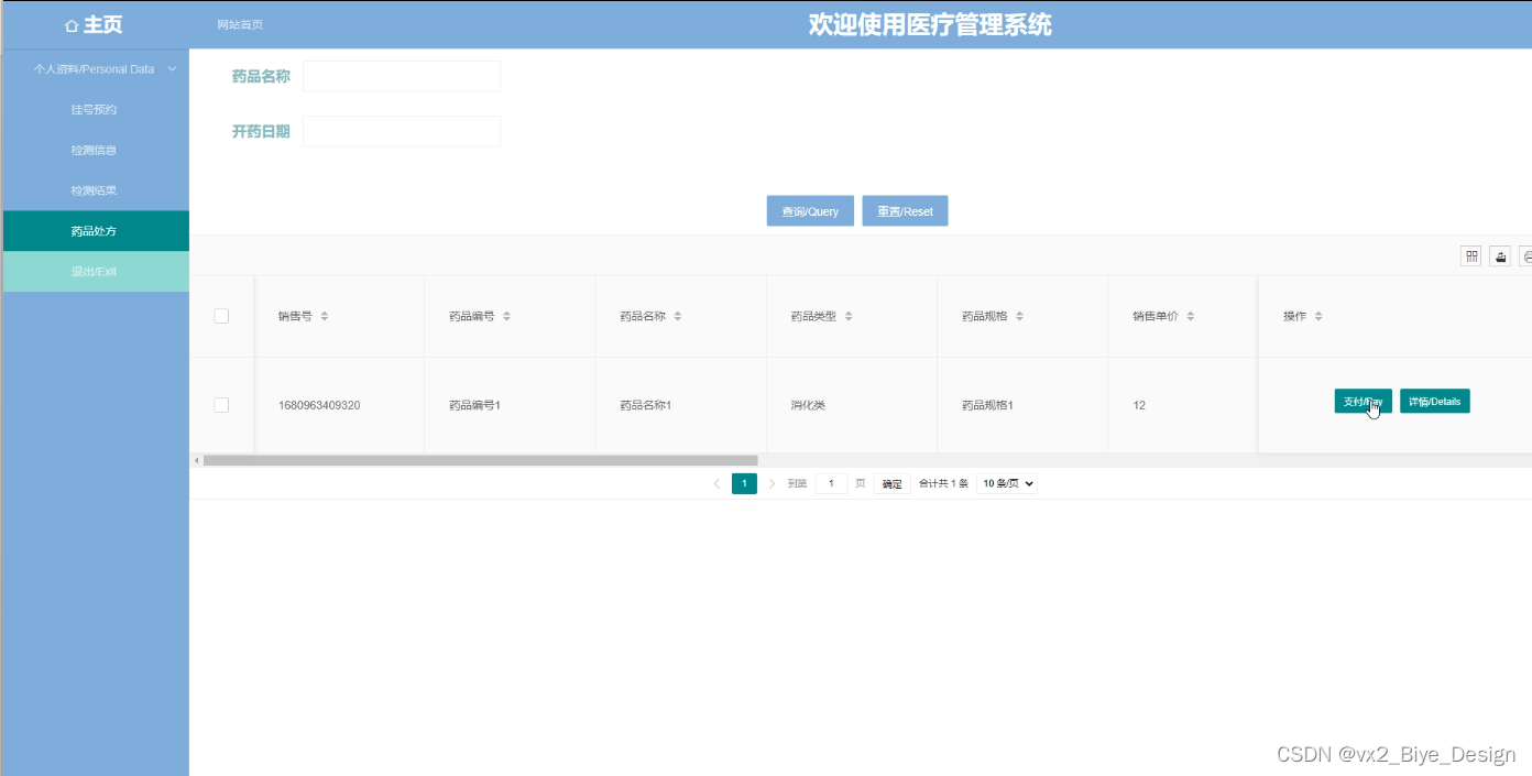 药品处方,进入在药品处方管理页面可以查看索引、销售号、药品编号、药品名称、药品类型、药品规格、销售单价等信息进行支付操作,如图5-5所示。