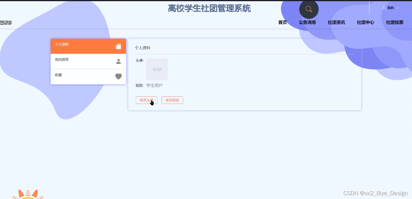 (8)个人中心:当用户点击右上角“我的”这个按钮,就会进入到对应的后台进行信息的管理了;