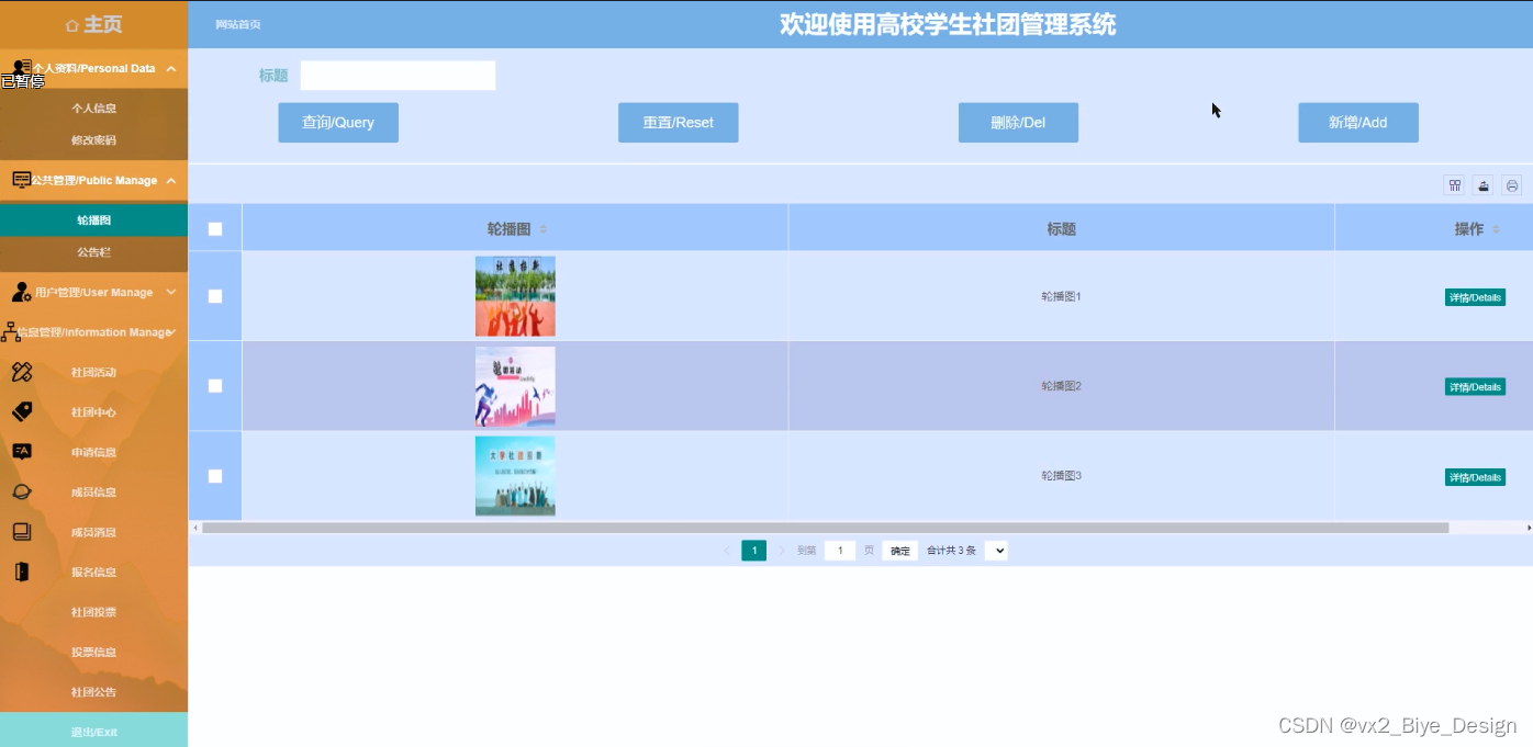 (2)公共管理:管理员点击“公共管理”这一菜单会显示轮播图、公告栏这两个子菜单,管理员可以对前台展示的公告消息和轮播图进行设置;