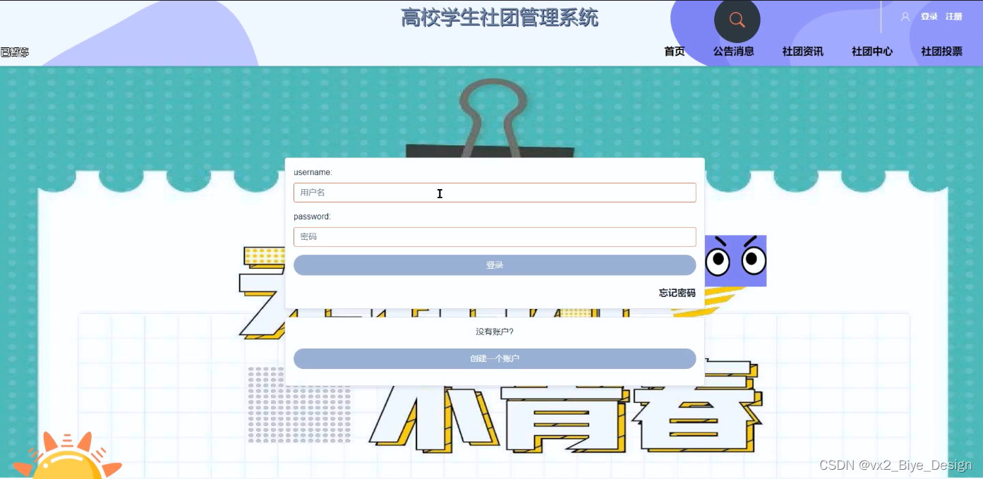 (1)首页信息:当用户进入本高校学生社团管理系统的前台的时候,首先展示在眼前的是导航栏、公告消息、社团资讯、社团中心、社团投票等信息,用户可以根据自己个人的需求进行查看;