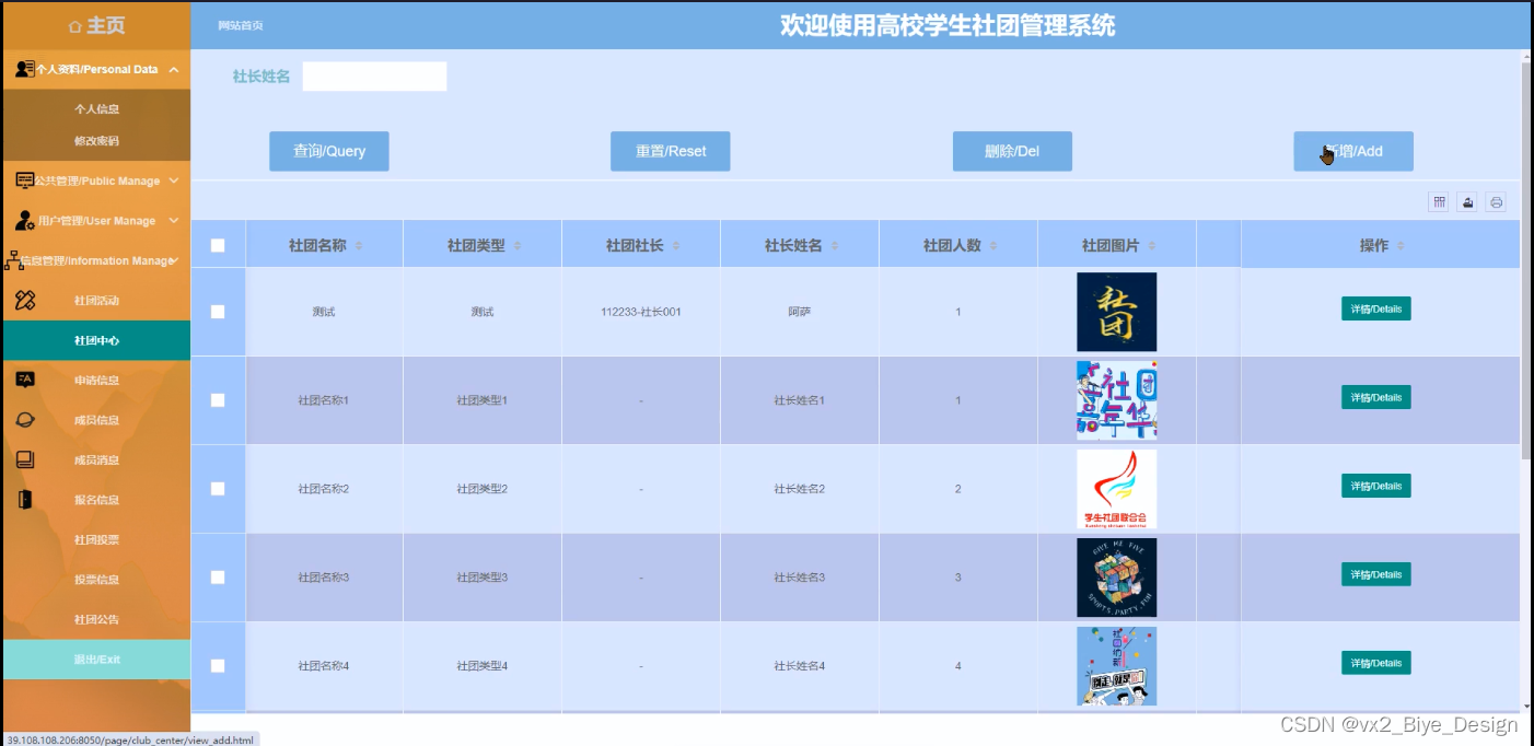 管理员点击“社团中心”会显示出所有的社团中心信息,支持输入社团名称对社团信息进行查询,如果想要添加新的社团中心信息,点击“添加”按钮,输入社团名称、社团类型、社团社长、社长姓名、社团人数等信息,点击“提交”按钮就可以添加了,同时可以选择某一条社团信息,点击“删除”进行删除。界面如下图4.14所示。