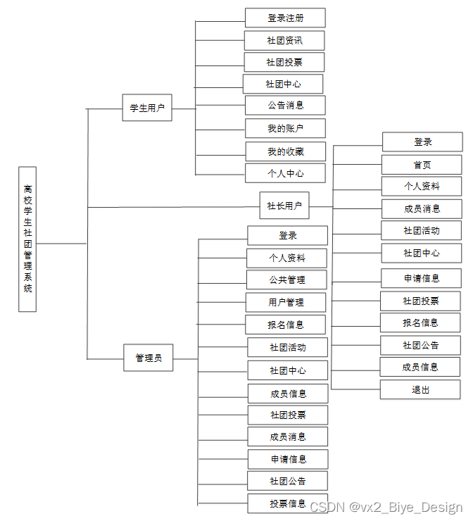 高校学生社团管理系统整体的功能模块包括管理员+学生用户+社长用户三个模块,实现了对学生社团相关信息的查询管理,系统功能模块如图所示。