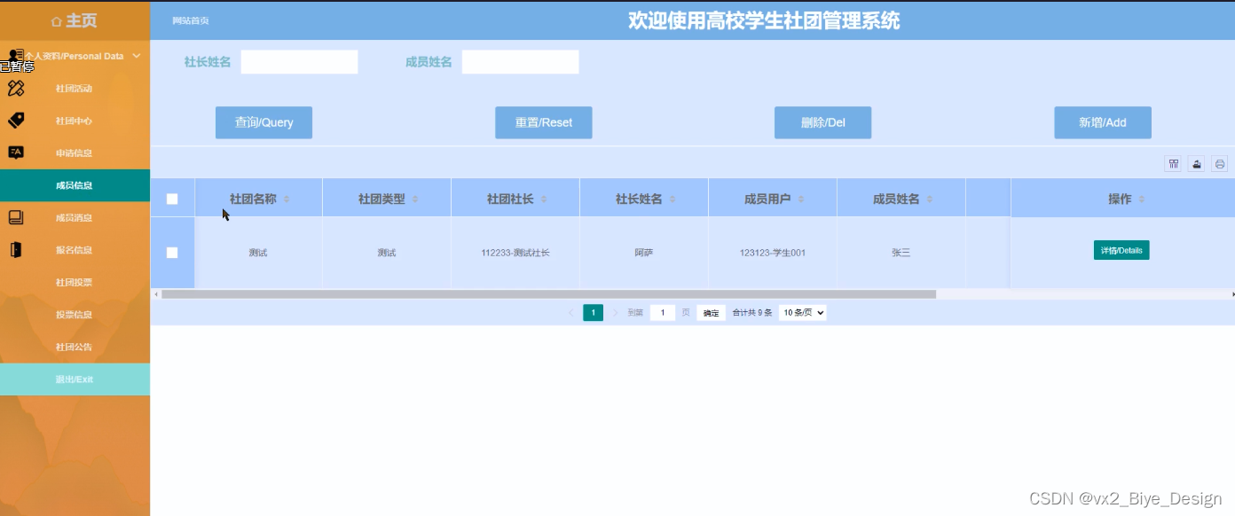 (6)成员信息:管理员点击“成员信息”会显示出所有的社团成员信息,支持输入社团名称或者社团社长对成员信息进行查询,如果想要添加新的成员信息,点击“新增”按钮,输入相关信息,点击“提交”按钮就可以添加了,同时可以选择某一条成员信息,点击“删除”进行删除;