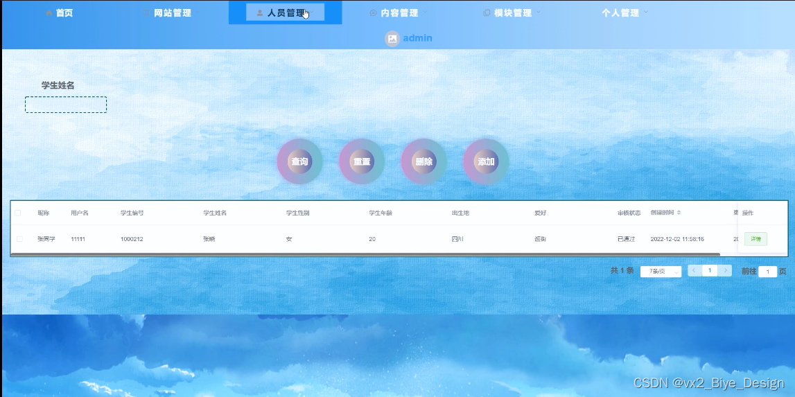 (3)人员管理:当点击“人员管理”这一菜单的时候,会出现管理员+学生用户+维修人员人三个子菜单,可以对这三个模块进行增删改查操作;
