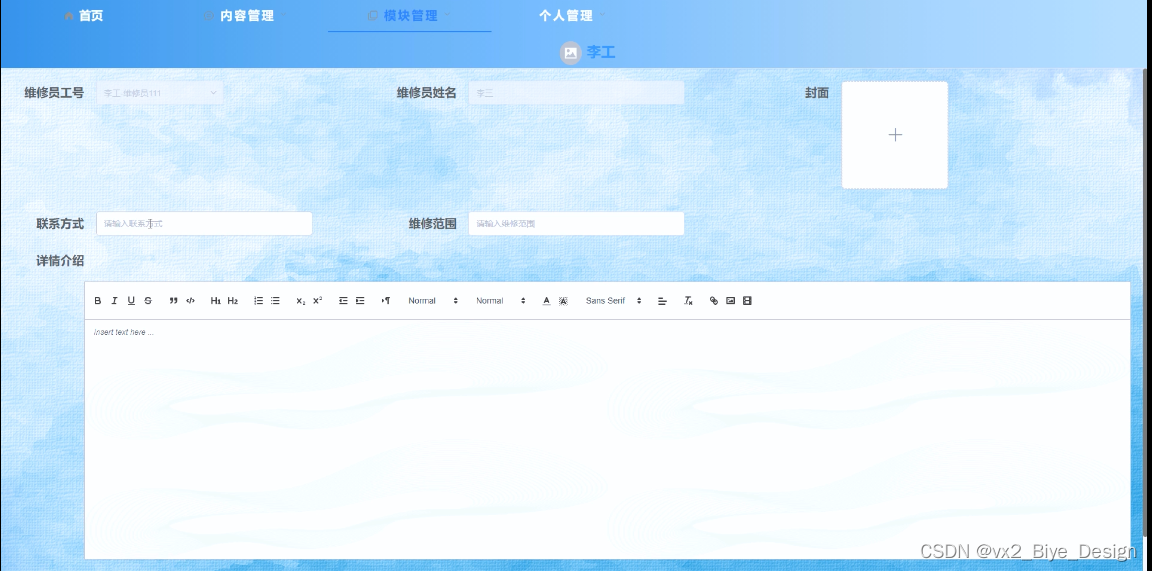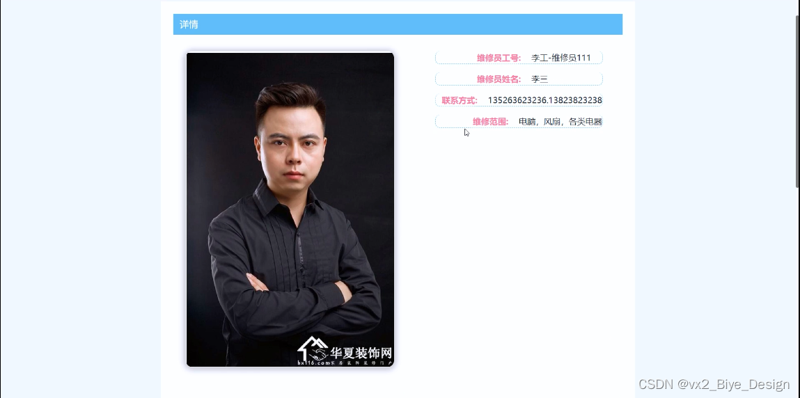 (9)维修介绍:在首页导航栏上点击“维修介绍”弹跳出的是维修介绍列表,可以点击随意一款维修员进行了解其具体信息。包括维修员工号、维修员姓名、联系方式、维修范围等;