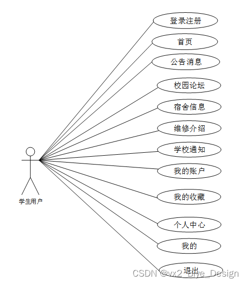 根据上一节功能分析,可以得出系统的用例,学生用户角色用例如图2.1所示。