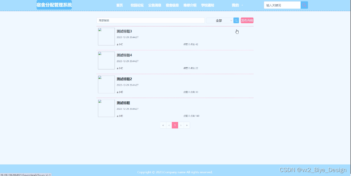 (2)校园论坛:在首页导航栏上我们会看到“校园论坛”这一菜单,我们点击进入进去以后,会看到所有论坛列表,在这个界面,我们可以点击进入进行查看、评论、点赞等;