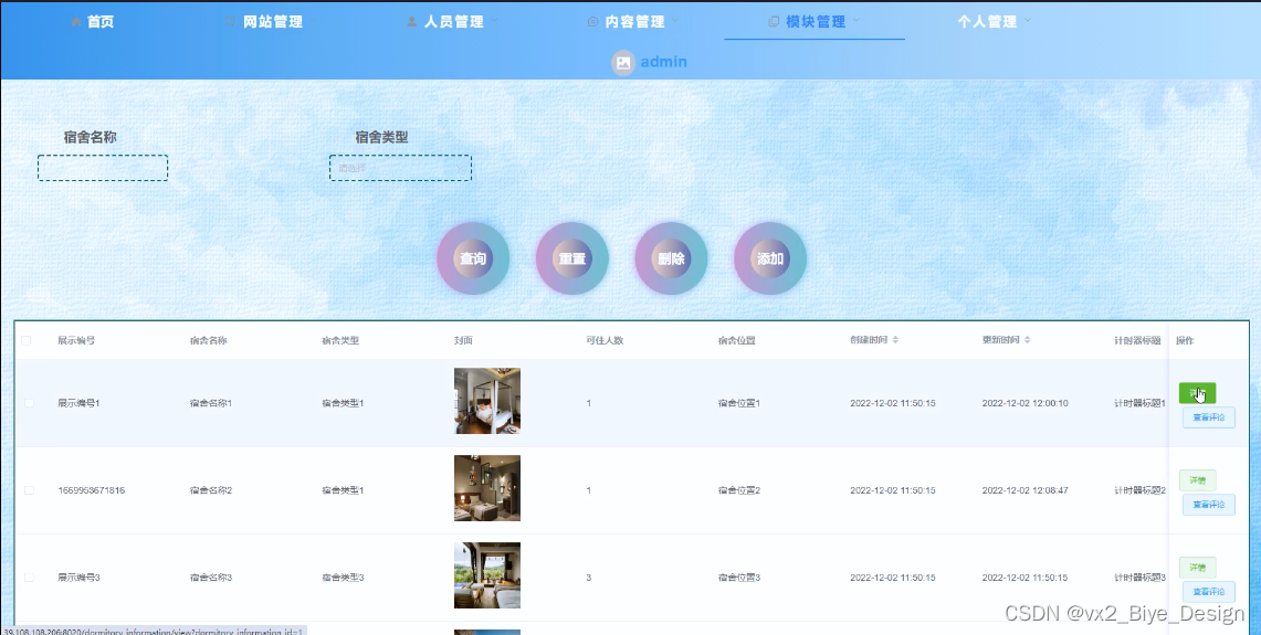 (7)宿舍信息:在首页导航栏上点击“宿舍信息”弹跳出的是宿舍信息列表,可以点击随意一款宿舍进行了解其具体信息。包括展示编号、宿舍名称、宿舍类型、可住人数、宿舍位置等;