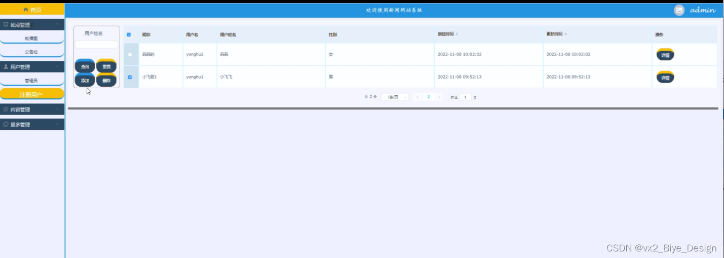 (2)用户管理:当点击“用户管理”这一菜单的时候,会出现管理员+注册用户两个子菜单,可以对这两个模块进行增删改查操作;