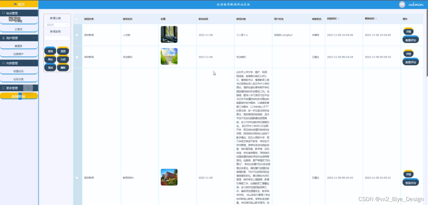 The main functional modules of the news website system include user management, campus forum, forum classification, and campus news. The object-oriented development mode is adopted for software development and hardware erection, which can well meet the needs of actual use. The corresponding software erection and program coding are improved. MySQL is adopted as the main storage unit of background data, and the SSM framework, JAVA technology Ajax technology is used to code and develop the business system, realizing all the functions of the system. This report first analyzes the background, role and significance of the research, laying a foundation for the rationality of the research work. According to the analysis of various requirements and technical problems of the news website system, this paper proves the necessity and technical feasibility of the system, and then makes a basic introduction to the technical software and design ideas needed for the design of the system. Finally, it implements the news website system and deploys and operates it.
