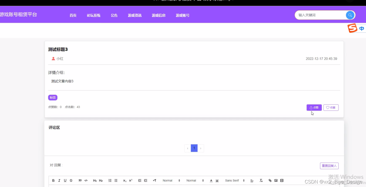 According to the research status and development trend of the game account rental platform, the system can be divided into front-end implementation and back-end implementation from demand analysis, structure design, database design to system implementation. The system strives to find a practical development plan based on the actual situation. After repeated research and learning, it uses Java programming language, JSP technology, MySQL database and Tomcat server to complete all the functions of the system, mainly according to user needs to complete the home page, broadcast map, bulletin board Resource management (game information, information classification) communication management (forum system, forum classification) system user (administrator, registered user, seller) module management (game classification, game information, game purchase, game account, user purchase number) and other functions, and finally conduct system testing to detect the system's permissions and vulnerabilities, so as to improve the system to meet the standards.
