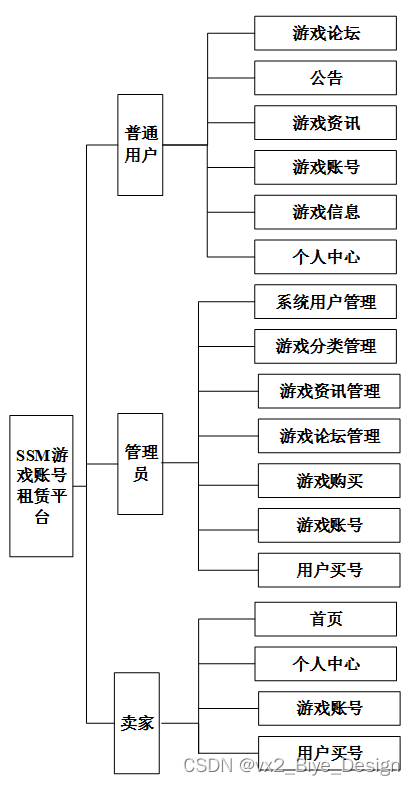 本系统主要分为前端和后端两大板块,其中包括了用户管理、留言管理、游戏分类管理、游戏账号管理、游戏论坛管理、官方账号管理、官方论坛管理、系统管理等功能模块。