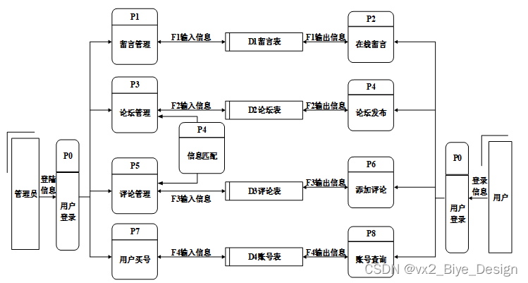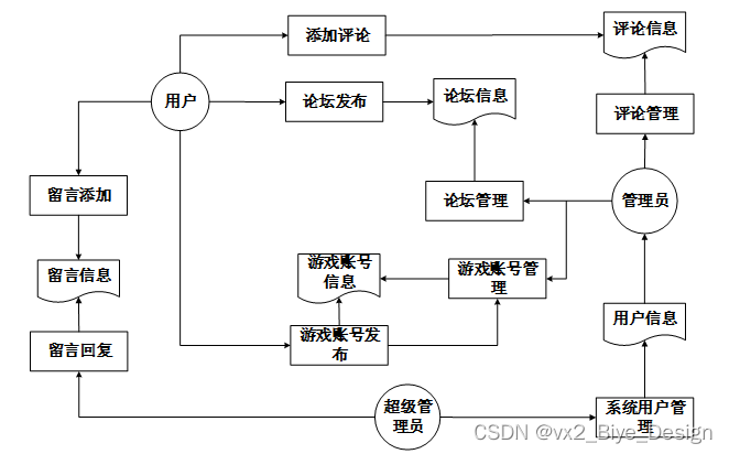 2层数据流图中,数据流实体主要是管理员,数据流程包括论坛管理、游戏账号管理;数据流包括添加信息、删除信息、修改信息、查询信息、浏览信息、提示信息;数据表包括游戏账号表、游戏论坛表。
