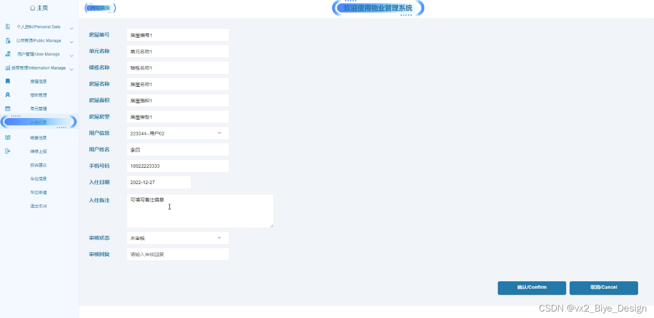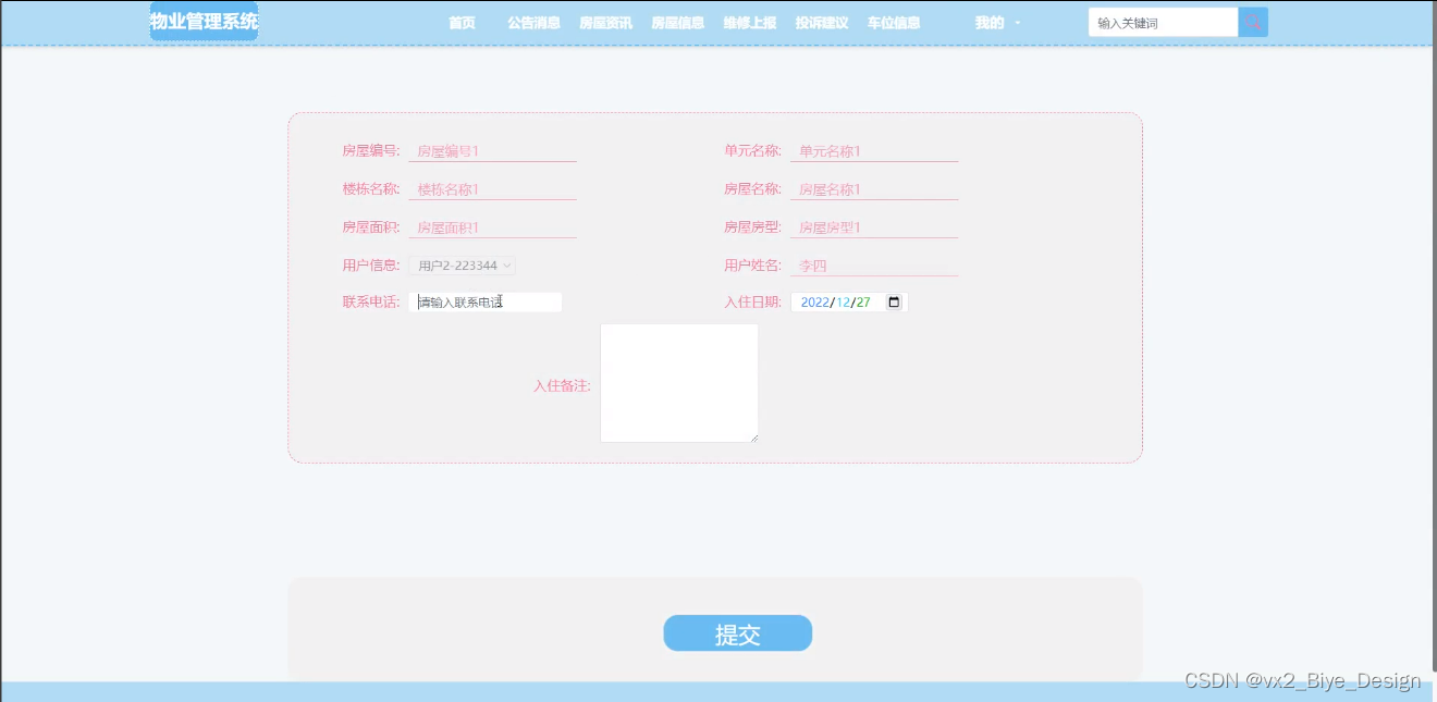 房屋信息,在房屋信息页面中通过填写房屋编号、单元名称、楼栋名称、房屋名称、房屋面积、房屋房型、用户信息、用户名称、联系电话、入住日期、入住备注等信息并提交,如图5-3所示。