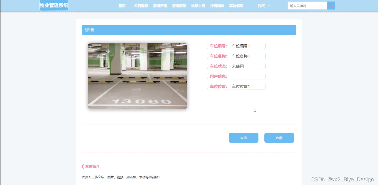 车辆信息,在车辆信息页面通过填写车位编号、车位名称、车位状态、用户信息、车位位置等信息并申请收藏,如图5-4所示。