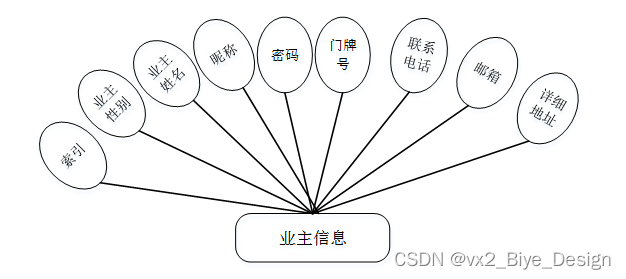 业主信息实体主要存储管理信息包括索引、用户性别、昵称、业主姓名、密码、门牌号、联系电话、邮箱、详细地址属性。业主信息属性图如图4-4所示。