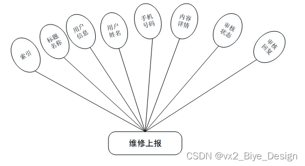 维修上报管理实体属性主要包括索引、标题名称、用户信息、用户姓名、手机号码、内容详情、审核状态、审核回复等属性。维修上报管理实体属性图如图4-6所示。