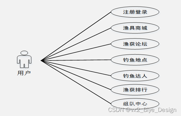 钓鱼分享平台基于现有的网络开发,可以实现管理员,用户管理(管理员、用户注册)公告管理(平台公告发布)交流管理(渔获论坛、论坛分类)商城管理(渔具商城、分类列表、订单列表)模块管理(钓鱼地点、钓鱼达人、渔获排名、组队中心、入队申请)等详细的了解及统计分析。实现用户:首页、公告浏览、渔获论坛、渔具商城、钓鱼达人、钓鱼地点、渔获排行、组队中心,根据系统功能需求建立的模块关系图如下图: