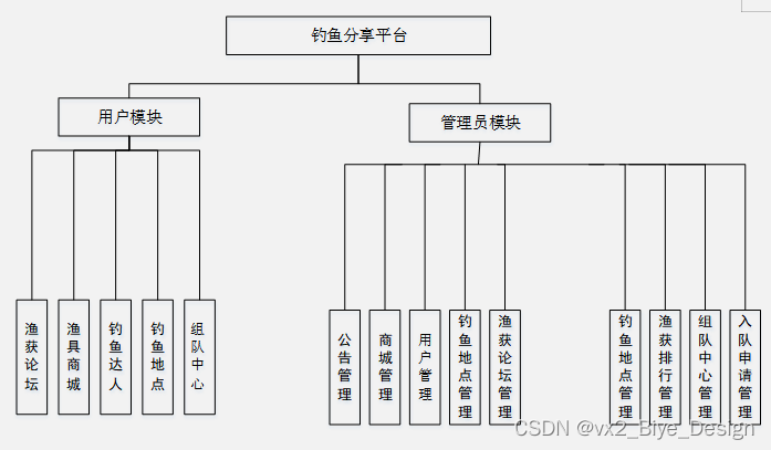 这些功能可以充分满足钓鱼分享平台的需求。此系统功能主要展示用户与管理员的功能结构,如图4-5所示。