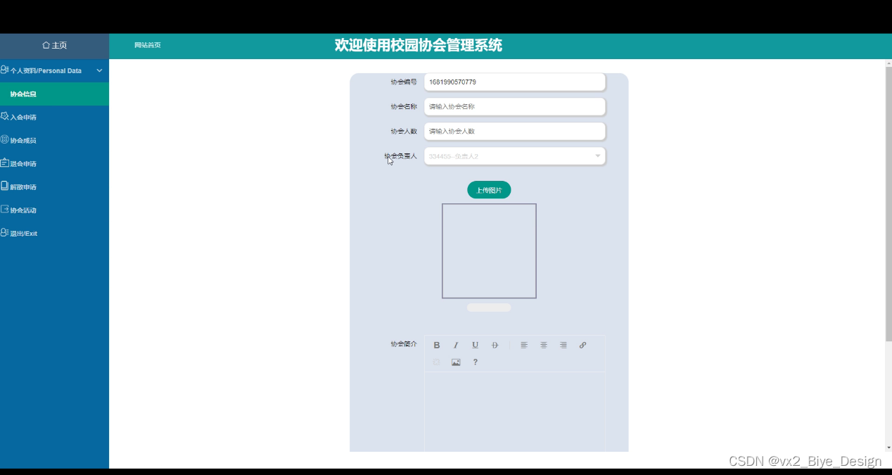 协会信息,在此页面可以通过填写负责人,协会名称,协会编号,人数,简介等信息创建协会,如下图所示。