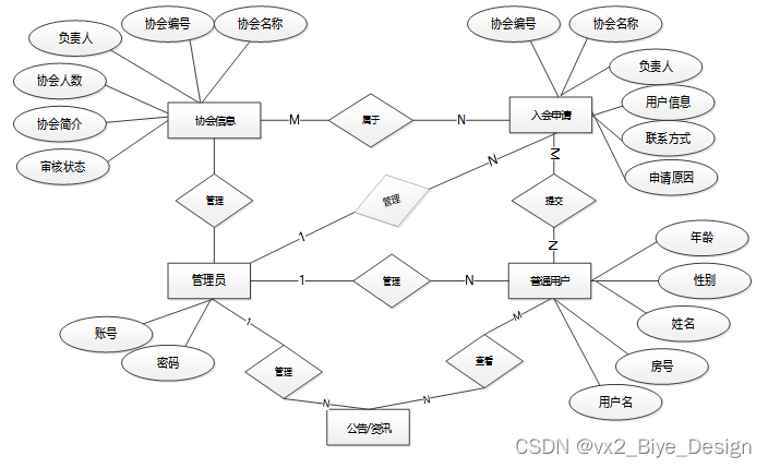 下面是整个校园协会管理系统中主要的数据库表总E-R实体关系图。