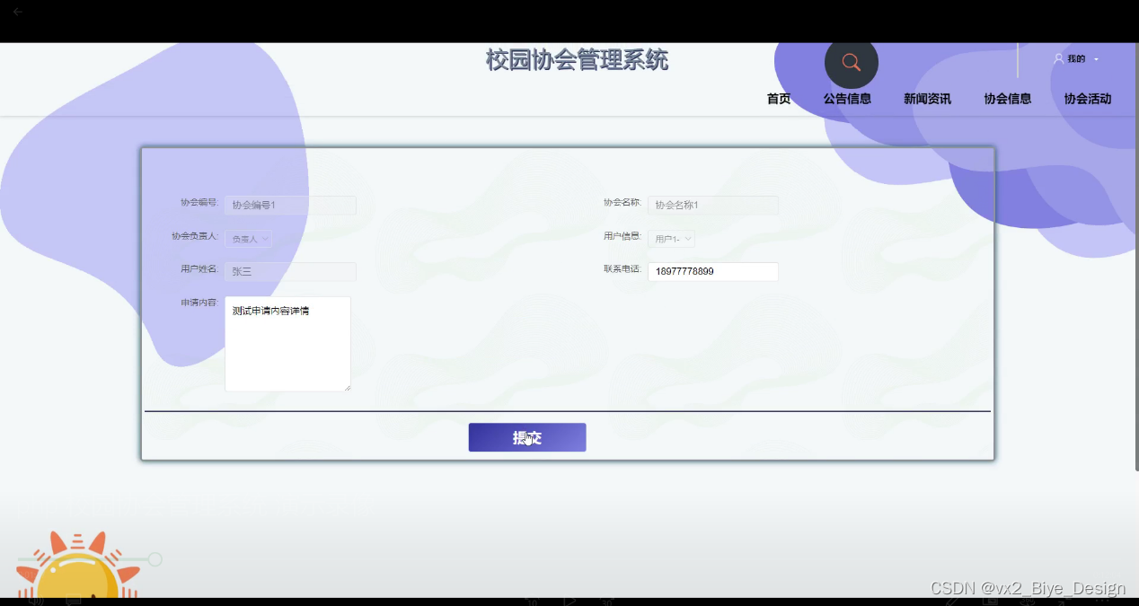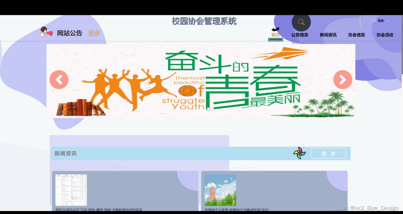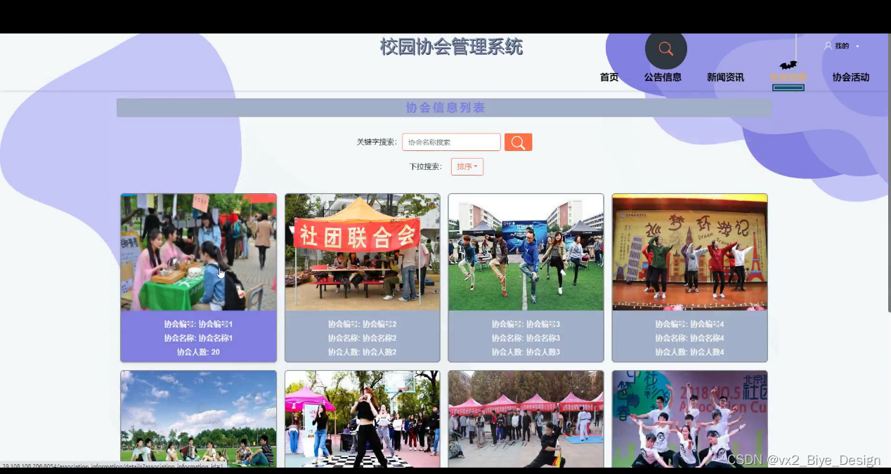 系统用户登录进入校园协会管理系统可以查看首页,公告信息,新闻资讯,协会信息,协会活动,入会申请,协会成员,退会申请等内容,如下图所示。