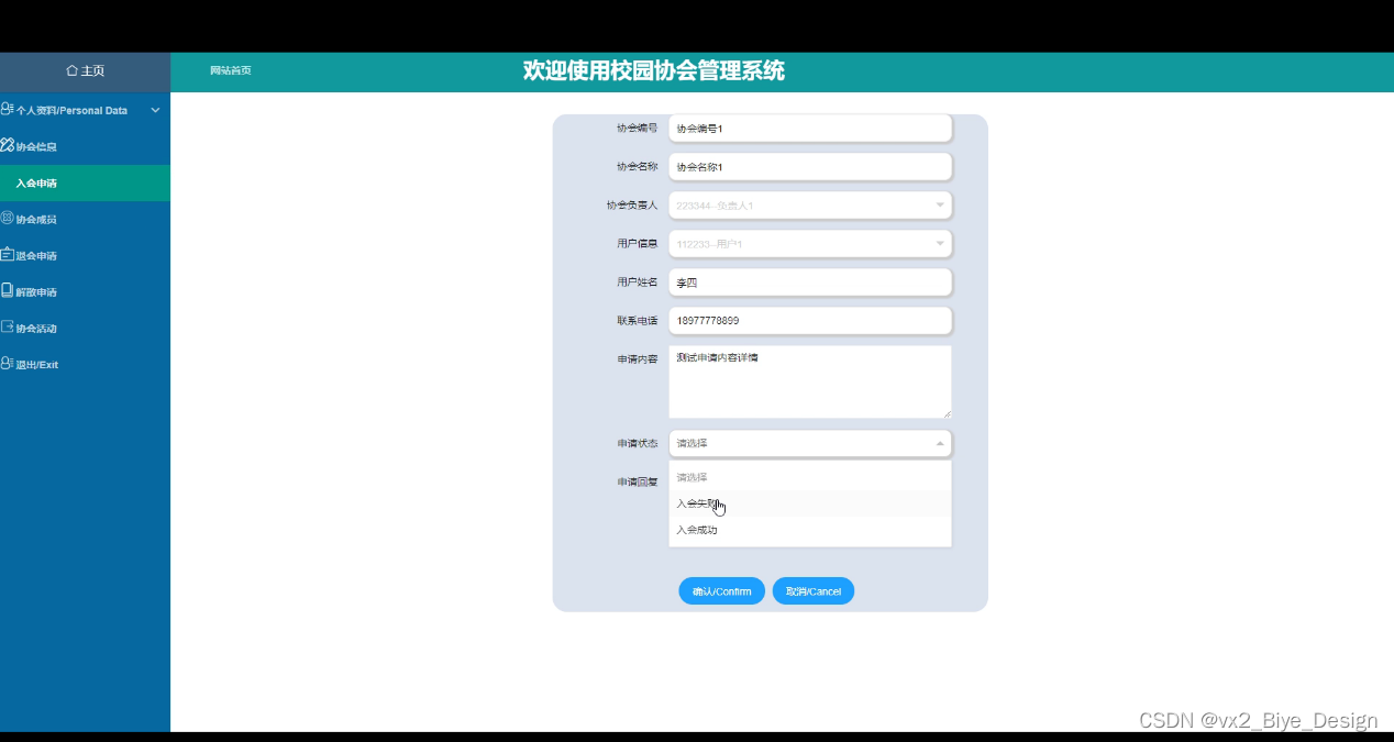 入会信息,在此页面可以查看用户提交的入会申请,包括用户信息,联系方式,申请原因等信息,通过入会申请后可以添加成员信息,并可根据需要进行新增、重置,删除,审核等操作,如下图所示。