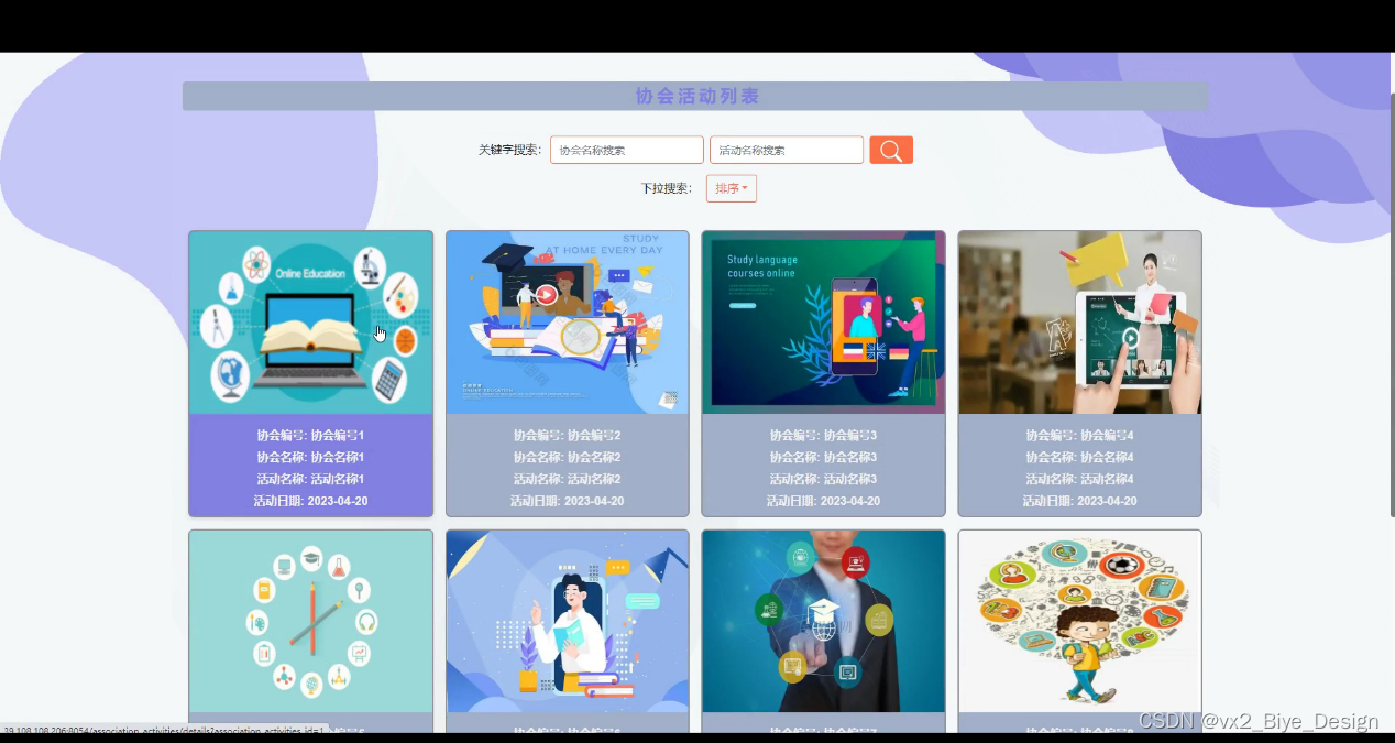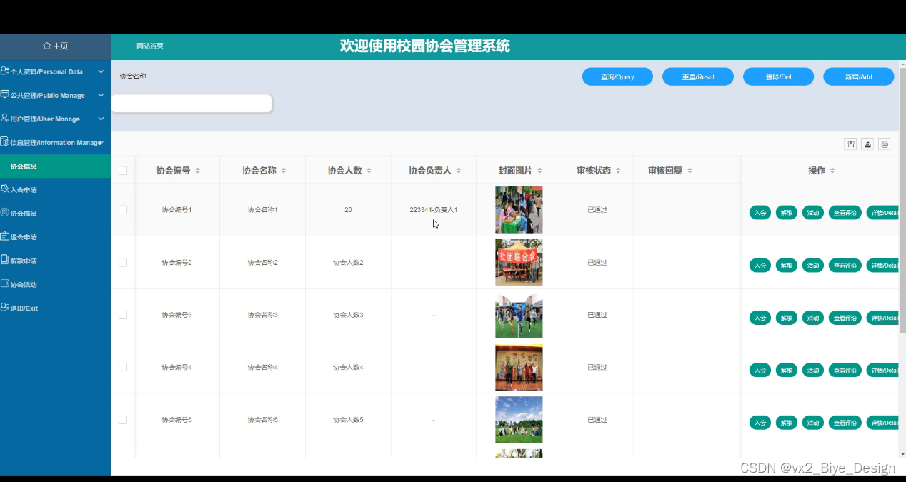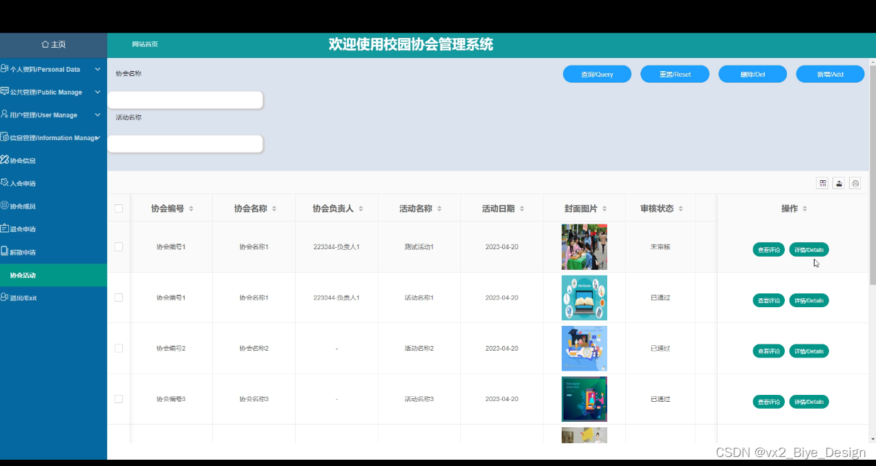 协会活动,在列表可以查看负责人提交的协会活动,包括负责人,协会名称,协会编号,活动名称,活动日期等等信息,并可根据需要进行新增、重置,删除,审核等操作,如下图所示。