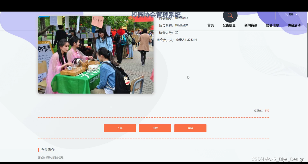 协会信息,可以查看负责人,协会名称,协会编号,人数,简介等信息,在详情页面可以进行点赞,收藏,评论,申请入会等操作,如下图所示。