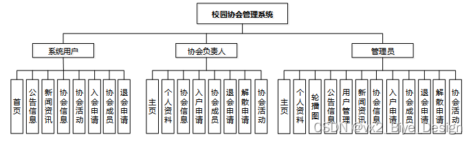 根据第二章中校园协会管理系统的功能分析可知,校园协会管理系统中整体功能模块图如图4.1所示,