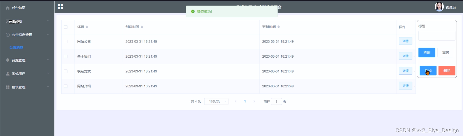 (5)公告消息管理:管理员可以对系统前台展示的公告消息进行增删改查,方便用户进行查看。