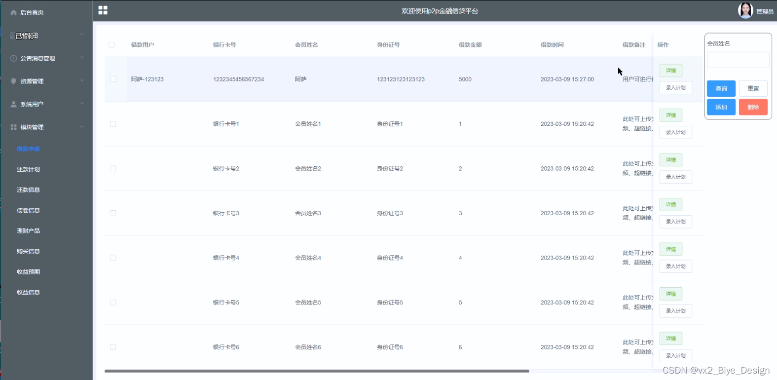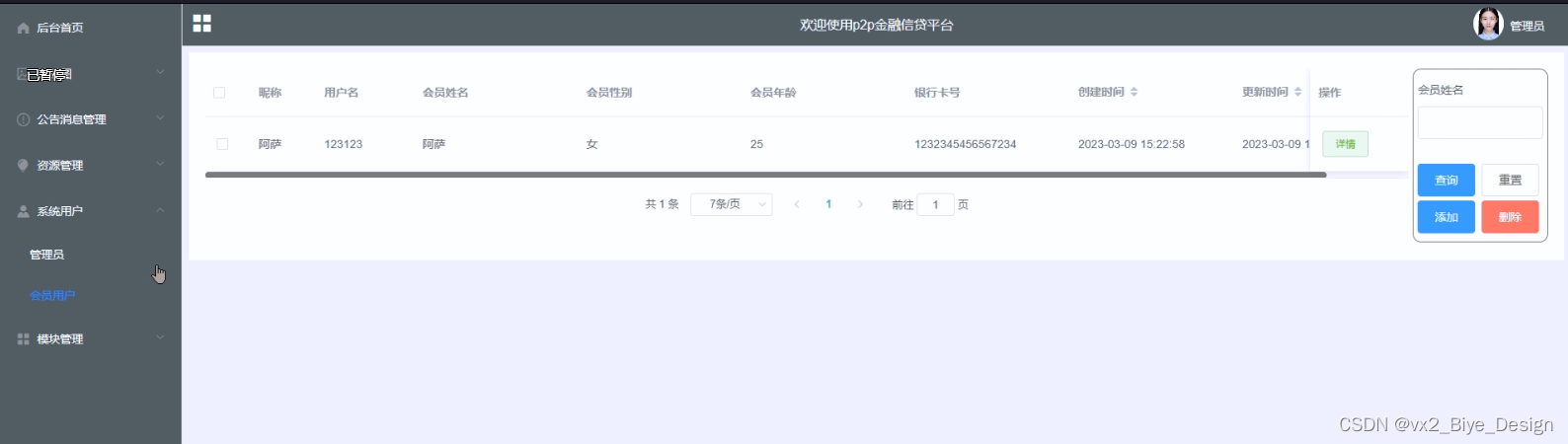 p2p金融信贷平台从角色上划分为了管理员以及会员用户两种角色。