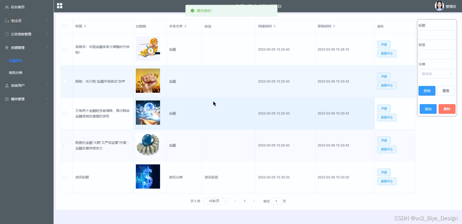 资源管理主要管理员是对金融资讯以及金融资讯所属的分类进行管控,包含了用户对金融资讯提交的评论信息,界面如下图4.9所示。